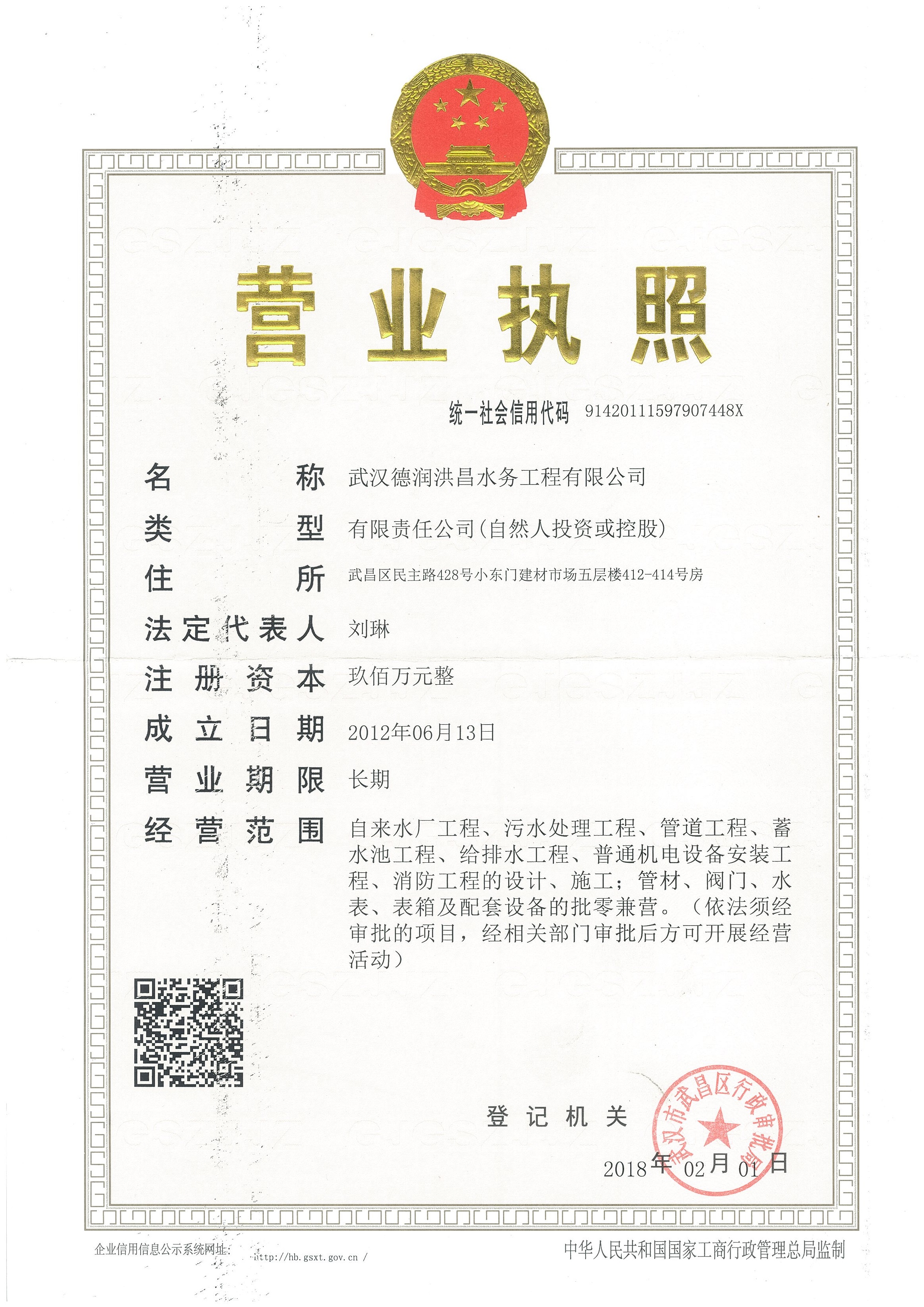 武漢德潤(rùn)洪昌水務(wù)工程有限公司(原名:武漢市洪昌水務(wù)工程有限公司)成立于2004年3 月,專業(yè)從事給、排水管網(wǎng)工程設(shè)計(jì)、施工;消防供水系統(tǒng)工程施工;中小型水廠的建設(shè)、改造工程;污水處理,蓄水池、泵房設(shè)備安裝工程。